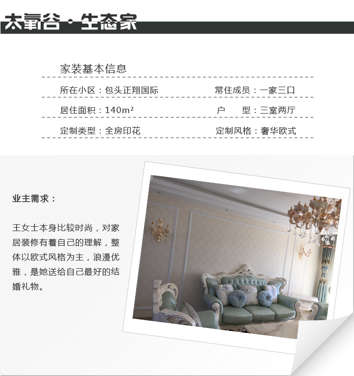 太氧谷硅藻泥的美好之處,她被太氧谷白炭黑印花絲絲入扣精雕細琢的質感效果驚艷到了,驚嘆于太氧谷能以平面的手法把印花做到超脫于墻紙墻布的細膩質感。環保與藝術的很好融合,歐式印花與她選擇的歐式家居相得益彰,正是她想要的完美效果。王女士是對完美有著更高追求的人,所以第一次她并沒有下定,而是在多品牌多方面對比之后,最終認可了太氧谷