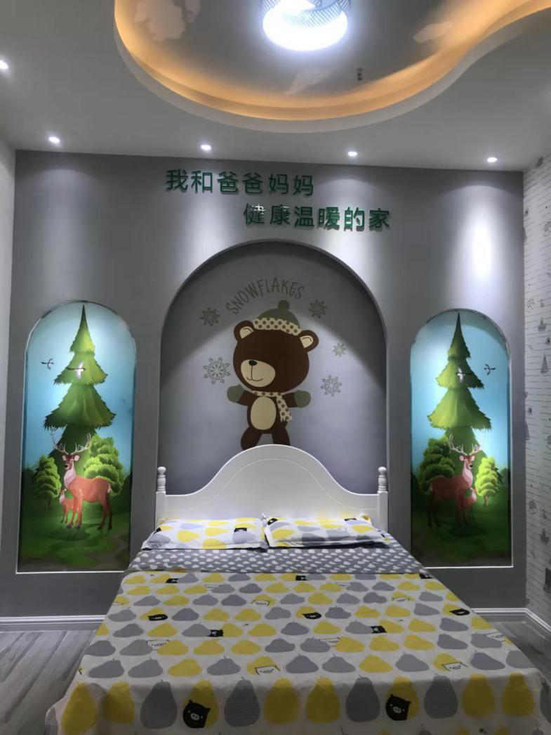 獨立的空間體驗,天真可愛的硅藻泥小熊圖案,色彩豐富的軟裝配飾,全方位展示了