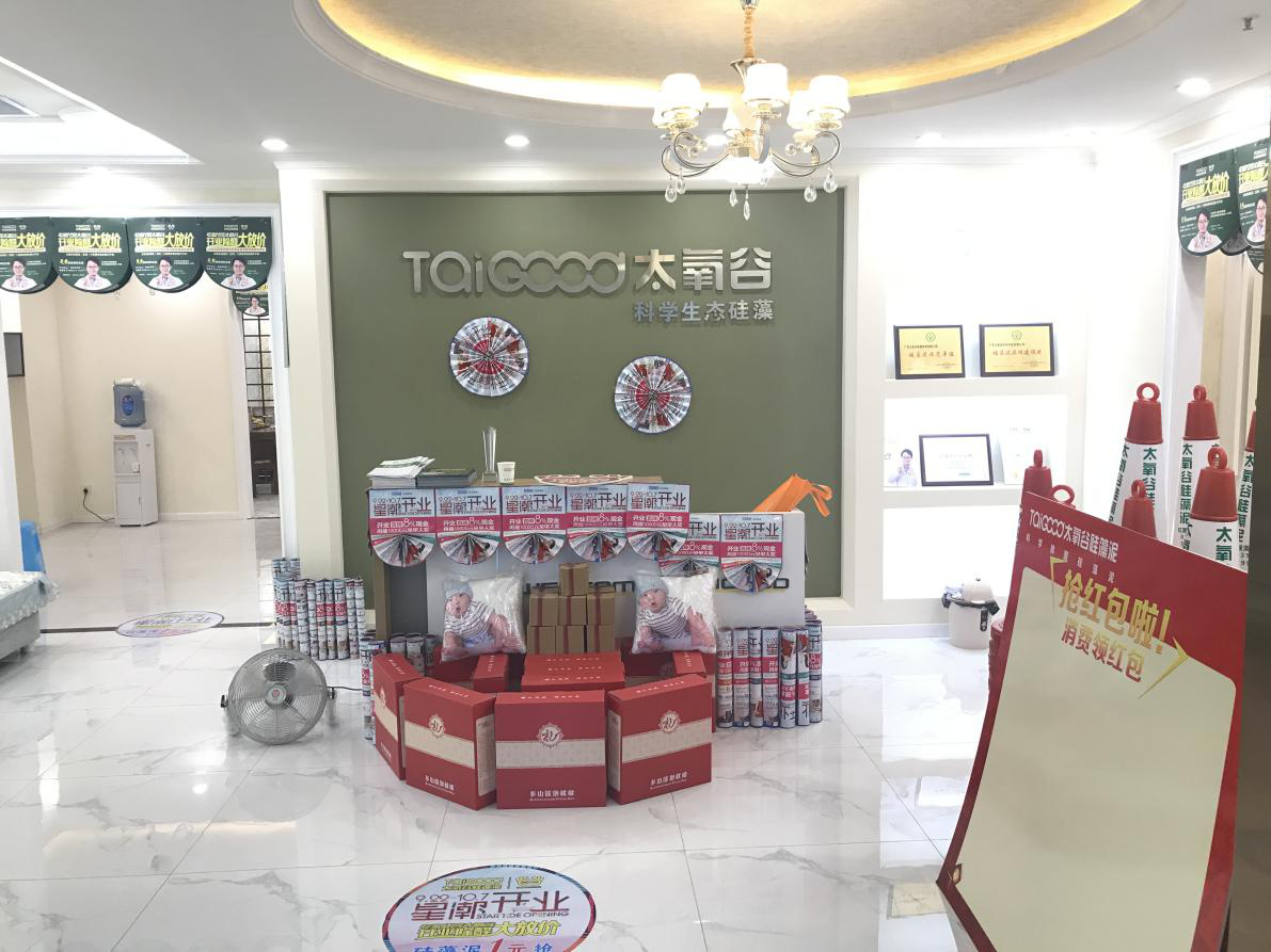 寬敞明亮的門店大廳,太氧谷硅藻泥的品牌設計墻前面堆滿了贈送的禮品,太氧谷硅藻泥的各項榮譽表彰無一不在向顧客展示著品牌的力量。