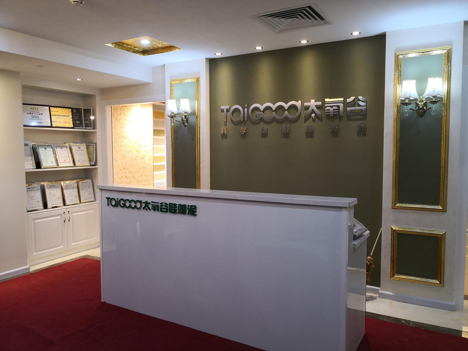 太氧谷硅藻泥的品牌設計墻,左邊擺滿了太氧谷品牌的榮譽表彰,即是國家對于太氧谷的肯定,亦是消費者選擇太氧谷的信心保障。