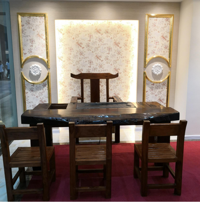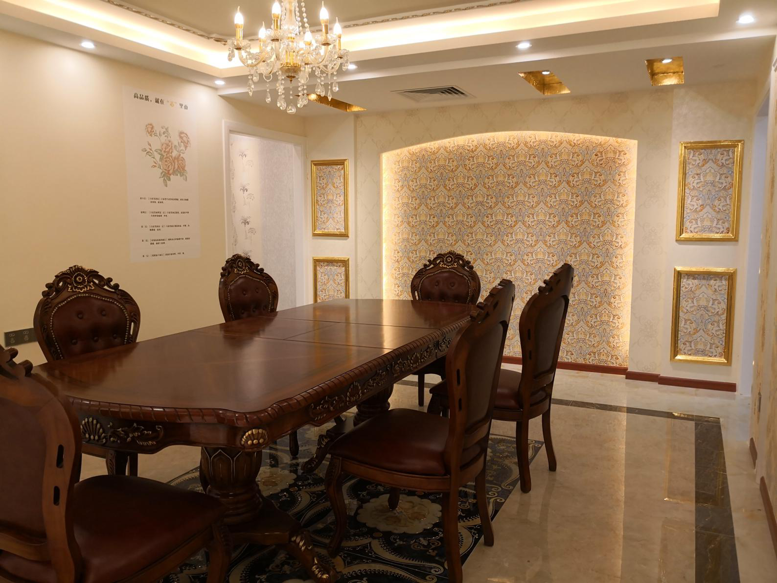 大廳展示的是太氧谷硅藻泥的旗艦臻品《漢莫拉比》,高端的墻面設計,莊嚴的宮廷風情家具,黃燦燦的宮廷吊燈,三者搭配和諧,呈現(xiàn)一派奢華莊重的風格。