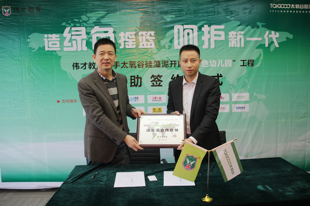 2015年12月4日,在偉才教育總部基地,太氧谷硅藻泥攜手著名教育機構香港偉才國際教育集團,舉行了以“造綠色搖籃、呵護新一代”為主題的盛大贊助簽約儀式暨工程啟動儀式,簽定贊助幼兒音體室硅藻免費裝修的公益協議并成功授牌,標志著太氧谷為偉才旗下30余所幼兒園音體室全新升級、環保改造正式拉開帷幕!偉才教育集團常務副總經理計濤先生、太氧谷品牌總監詹耀東先生共同出席了本次簽約儀式。本次活動得到CCTV、新華網、央廣網、鳳凰網、騰訊、新浪、搜狐、中國環保新聞網、中國建材網、中華硅藻泥網等在內的國內多家主流權威媒體全程支持。