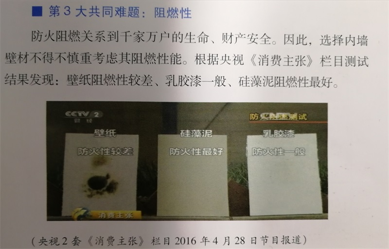 硅藻泥行業(yè)首部代表專家觀點(diǎn)的權(quán)威指導(dǎo)書《墻面健康涂裝藍(lán)皮書(2017)》在闡述墻面材料共同難題時(shí),曾以央視《消費(fèi)主張》欄目做過壁紙、硅藻泥、乳膠漆三大墻面裝飾材料的火燒實(shí)驗(yàn)作舉例,結(jié)果如下圖: