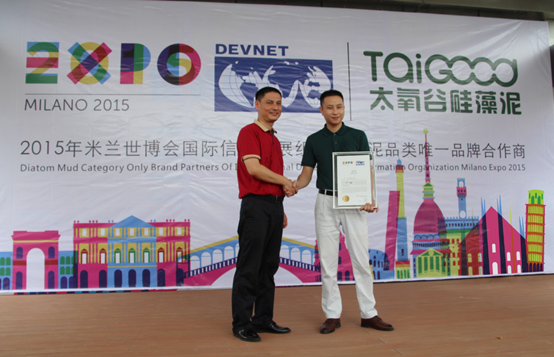 2015年6月5日,在美麗的羊城廣州,廣州太氧谷環保科技有限公司與2015米蘭世博會及國際信息發展組織正式簽署了戰略合作協議,并舉行了盛大的授牌儀式!國際信息發展組織中國代表處商務總干事虞光先生親自頒發證書并正式宣布太氧谷硅藻泥成為2015米蘭世博會及國際信息發展組織唯一指定硅藻泥品牌!