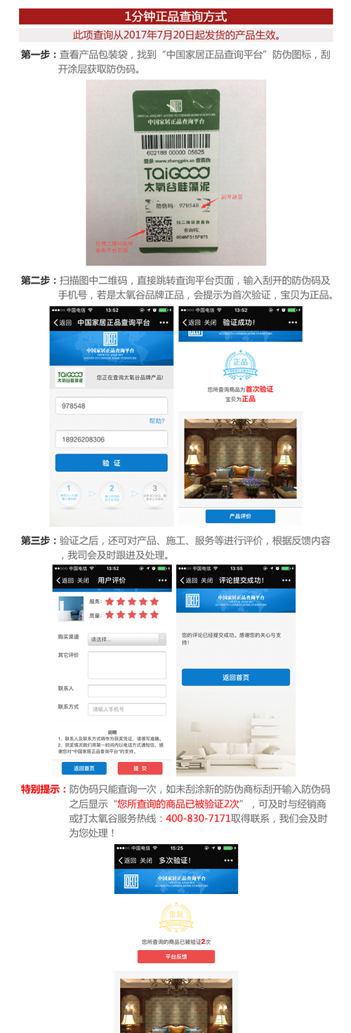 太氧谷硅藻泥強勢入駐由中國質量中心與紅星美凱龍共同搭建的中國家居正品查詢平臺,該平臺綜合了NFC及二維碼識別技術,對加入平臺的每一件家居商品都會生成獨立的編號。消費者在購買太氧谷出廠的品牌正品時,通過包裝袋的編號,掃描上面的防偽標簽二維碼,刮開涂層獲取防偽碼,就能即時辨別出產品的真假,徹底杜絕買到假冒偽劣產品的隱患,確保消費者能夠買到貨真價實的