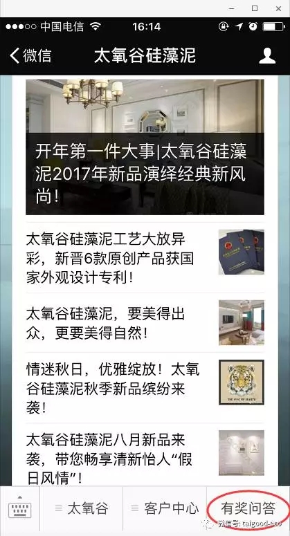 太氧谷硅藻泥,微信號:taigood-fuwu】,選擇右下方欄目“有獎問答”,即可直達游戲首頁。記住,彼公眾號非此公眾號,是太氧谷品牌運營的另外一個公眾服務(wù)號。 為什么要這么麻煩用服務(wù)號,當(dāng)然是為了方便給大家發(fā)紅包呀!