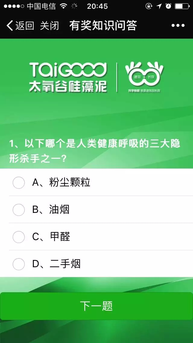 當(dāng)然,想要參與到抽獎環(huán)節(jié),要先通過我們設(shè)置的關(guān)卡答題考驗,題目會圍繞甲醛危害、