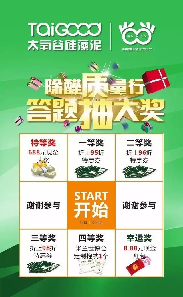 太氧谷的宗旨是盡量做到獎品人人有份,永不落空!這不,答題送現(xiàn)金大獎的游戲互動又雙叒叕來啦!這次太氧谷8月全國大型促銷活動“除醛質(zhì)量行”伴隨著贏大獎即將火爆開啟!