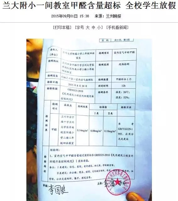 《蘭大附小一間教室檢測甲醛超標,全校學生放假》一份甲醛超標書檢測書震驚學生家長。學校新擴建、粉刷的教室,油漆味重。尤其是位于一樓的8間教室,氣味刺鼻。幾位家長表示,部分孩子周二上了一天課,回家后都反映身體不舒服,不愿意在教室里學習。為孩子健康考慮,家長們只好聯名向校方請假。