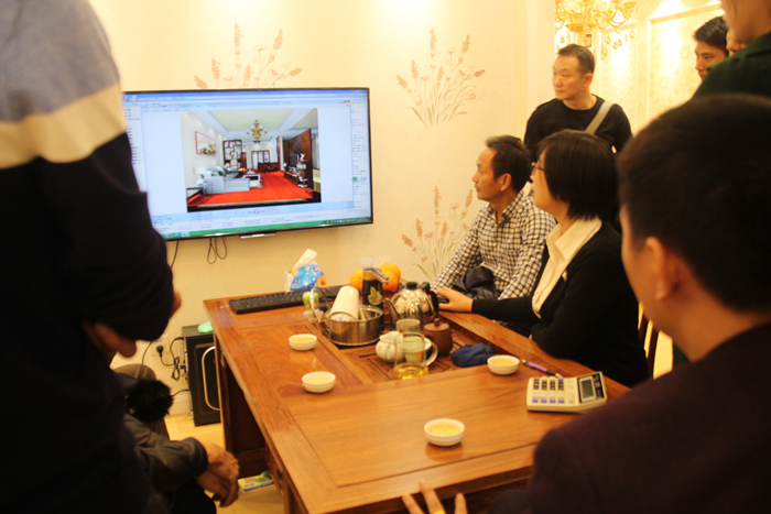 張總帶領(lǐng)意向加盟商參觀展廳,展示品牌實力