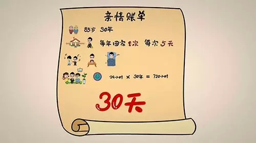 你是否有細細的算過你的親情“賬單”,假如父母有幸能夠活到85歲高壽,還有30年,自己平均每年回家1次,每次5天,減去應酬、吃飯、睡覺等時間,真正能陪在父母身邊的大概只有約24小時,30年總共才720小時,也就是差不多30天。