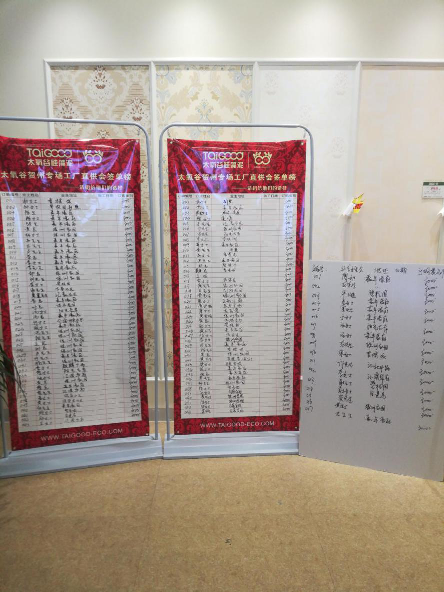2018年4月28日,在廣西賀州順利圓滿落幕的太氧谷硅藻泥工廠直供會,當天,太氧谷氣勢如虹霸氣簽下103單,因為當天是工作日,有部分業主未到場,在隔天,這部分業主相繼到賀州門店補簽了11單,此次賀州活動,以共簽114單的傲人成績,再次華麗刷爆太氧谷史上單店單場的銷售記錄!這種模式的成功再一次得到強有力的論證。