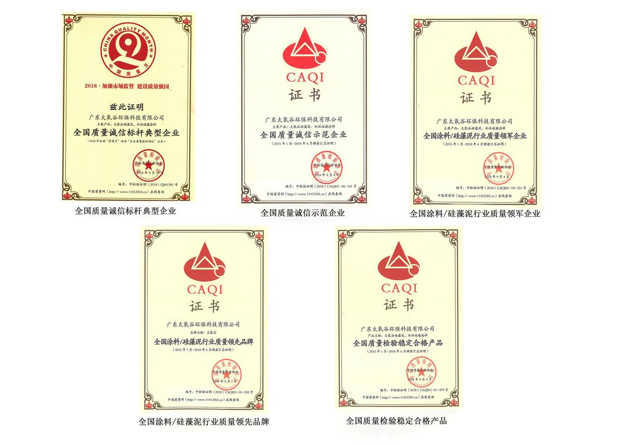 太氧谷硅藻泥以卓越的產品品質獲得國家“質量月”活動五項質量大獎殊榮,是硅藻泥行業中唯一同時獲得五項獎項的企業。