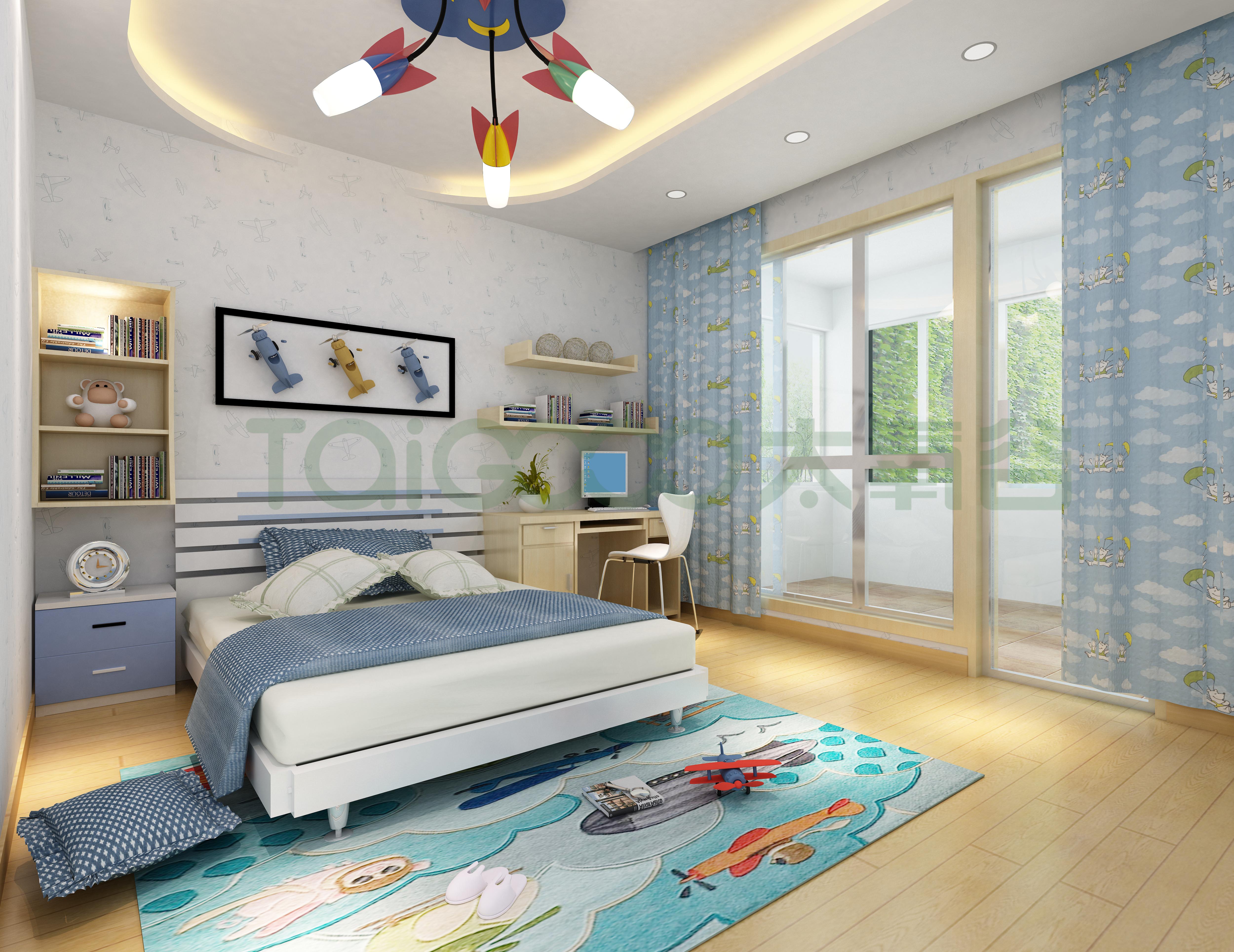 各式各樣的飛機圖案,承載著孩子朝著廣闊的天空起飛。天藍花俏的窗簾、豐富的飛行元素,編織出孩子的夢想藍圖。