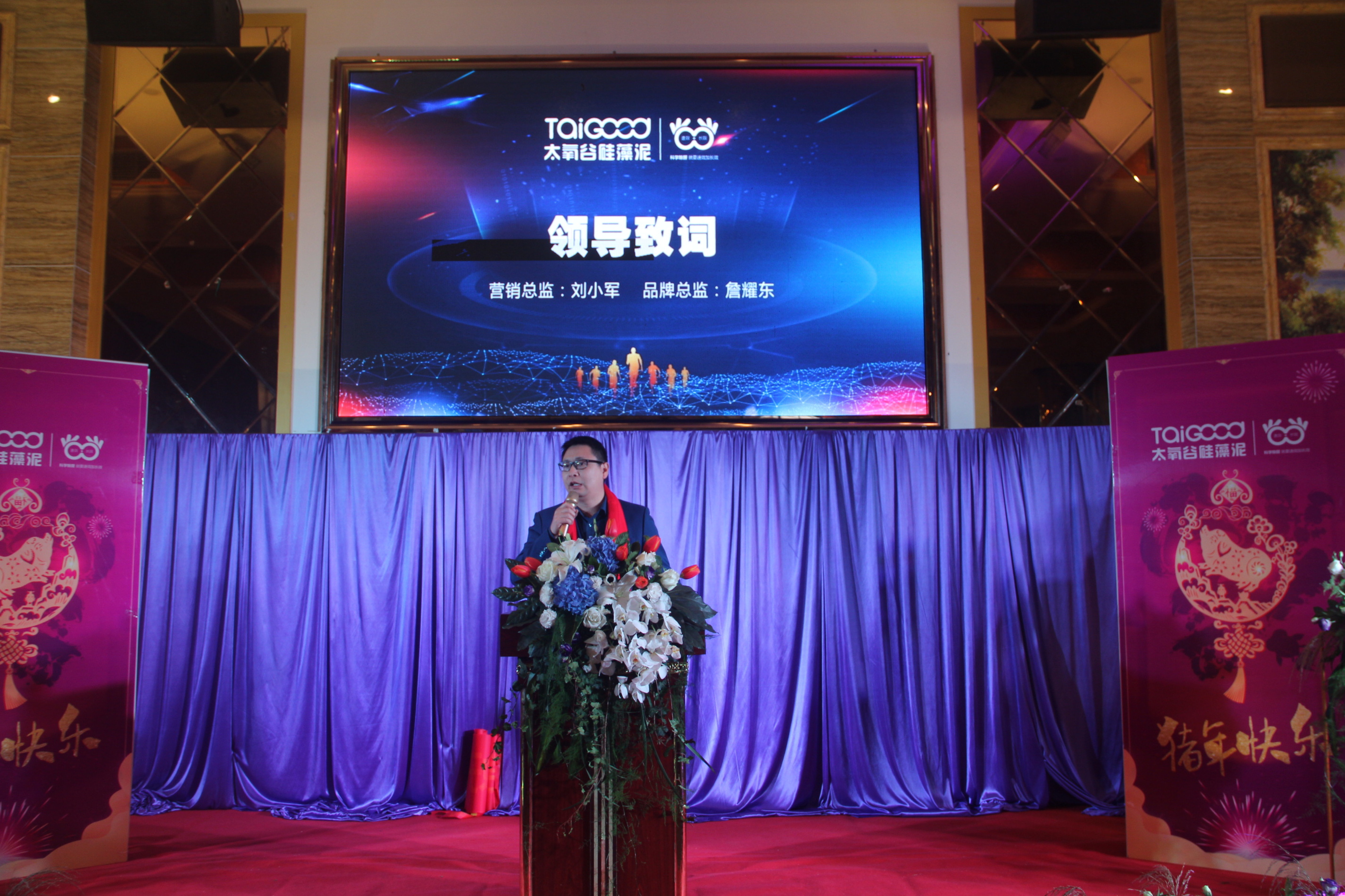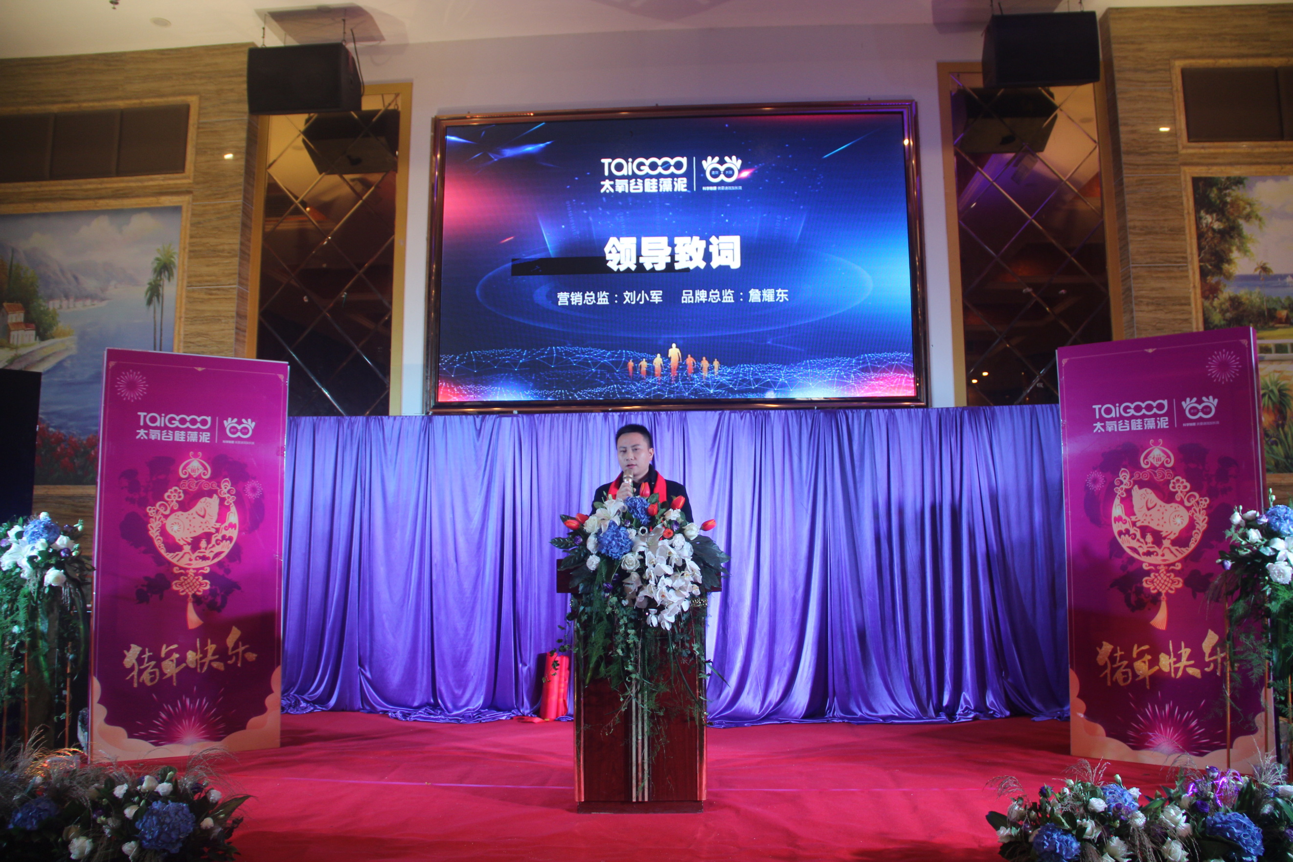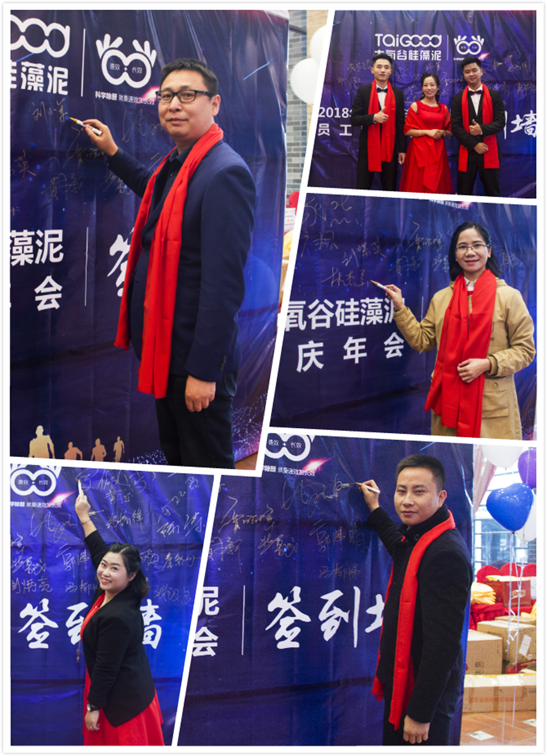 太氧谷硅藻泥2018年會正式拉開帷幕,全體人員陸陸續續進場簽到,手中緊握著代表自己的幸運抽獎劵,紛紛來到簽到墻簽名留影。4點30分,到場人員有序入座,三位主持人宣布晚會正式開始,并邀請了太氧谷營銷總監劉總及太氧谷品牌總監詹總分別為晚會致辭。