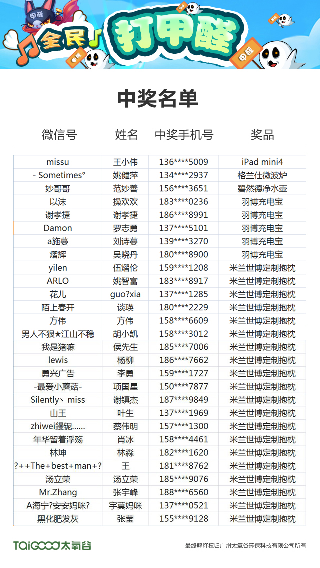 恭喜以上中獎的小伙伴們,太氧谷工作人員會盡快與各位取得聯系,獎品將通過郵寄等方式送至各位的手中!沒有中獎的小伙伴也不用傷心,游戲的樂趣就是重在參與,太氧谷希望通過此次活動,讓更多的人更深的意識到甲醛的嚴重危害性,號召所有人都能夠參與到消滅甲醛的行列中,當然消滅的不是游戲的甲醛,而是現實生活中無處不在的甲醛!甲醛是人人喊打的大危害,想消滅它還得用太氧谷硅藻泥!