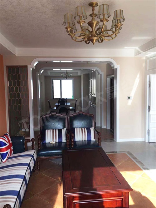 沙發背景墻與地面裝飾設計相呼應,暖暖的空間色調,經典的美式沙發,在窗外的光照下,閃爍著迷人的光澤,充滿美式元素的簡約美式吊燈也帶來了一絲奢華的明亮之感,盡顯客廳典雅又浪漫的情調。