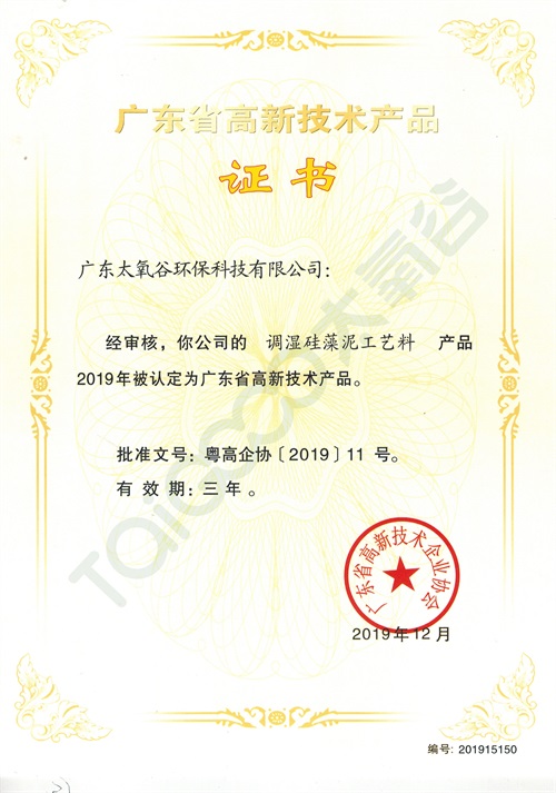 太氧谷作為高新技術環保企業,一直堅持科技與環保相結合的發展之路,致力于開發科技、環保、健康、生態及安全的產品,生產的產品先后通過國家建筑材料測試中心檢測認證、新華網防輻射合格檢測、ISO9001:2008國際質量體系認證、國家質量認證中心中國環保產品認證、國際“雙采標”認證、中國環境標志產品認證等 。于2019年12月,太氧谷硅藻泥被認定為“廣東省高新技術產品”!