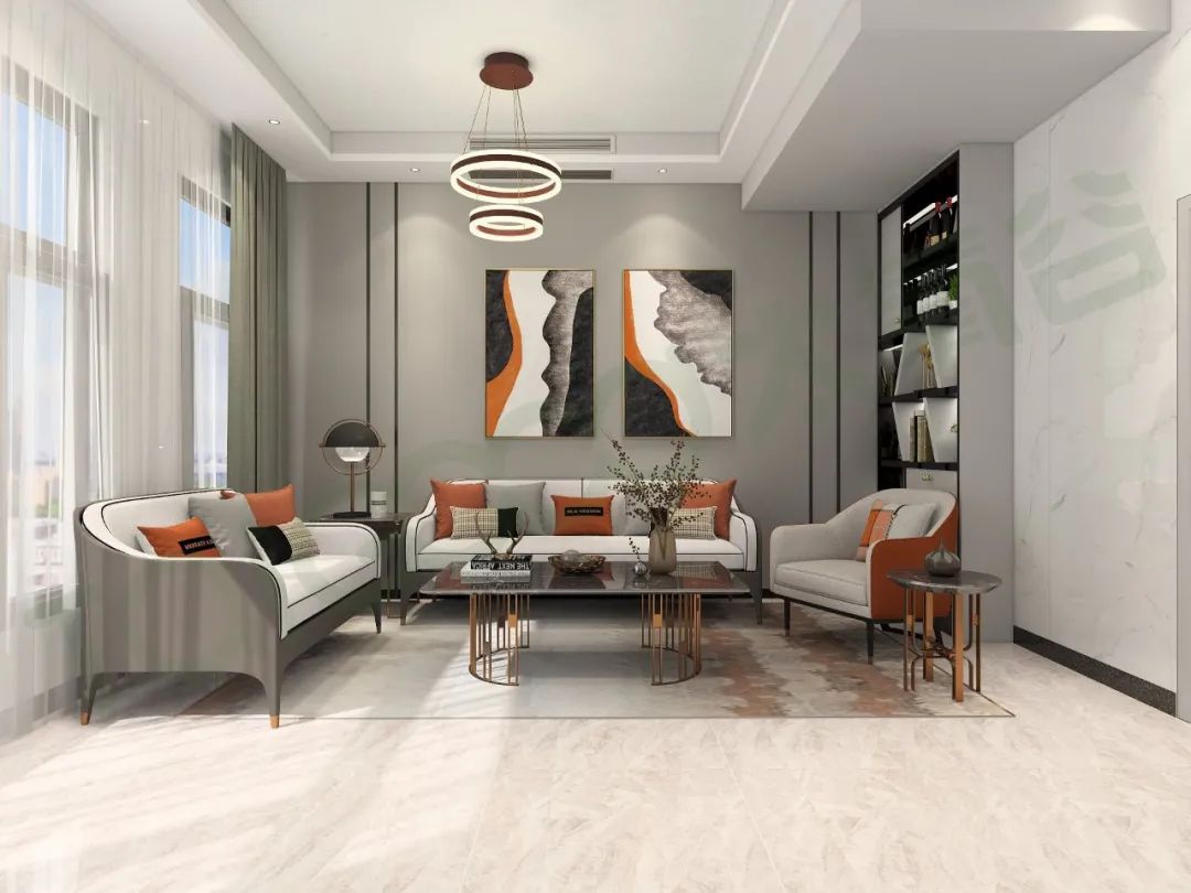 客廳整個空間以大片米灰調為基底,簡潔雅致的素色基調,不同明度的陳設,增強了空間層次感,愛馬仕橙的點睛配色,增添了設計中沉穩奢華的元素,呈現出優雅之感,創意裝飾畫也為整體視覺帶來奇妙的藝術感。