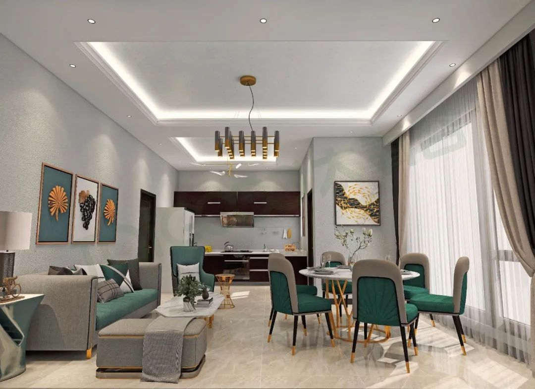 合二為一的開放式廚餐廳,獨立又相融,素灰調的墻面為基調,注入高雅的灰綠色調以及黃銅元素,空間陳設氛圍充滿生活氣息,簡約舒適中有一種高貴冷艷的輕奢感,雅奢氛圍蔓延開來~