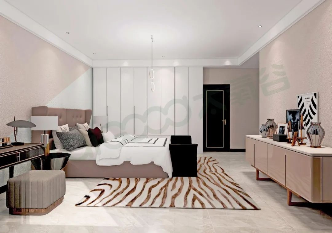 主臥以煙粉色為主色調,營造柔和舒緩的睡眠氛圍,滿足女主喜歡輕柔舒適的設計質感,白色衣柜在充分滿足衣物收納需求的同時,與整個色調及風格相呼應,完美融合。精致的軟裝飾品以黑白灰作為搭配色調,營造出一種輕盈而又高檔的空間感,整體演繹美而不膩的輕奢腔調。