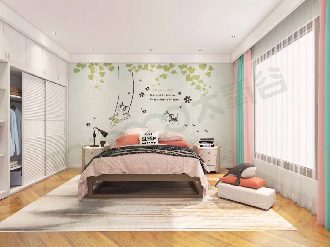 女兒房以柔和淺色調為主,淺綠調墻面生動有趣的圖案,讓空間充滿了趣味性與夢幻感,白色、粉色系為空間軟裝搭配的大色塊,配以暖色調的木紋地板,營造溫馨歡樂的空間氛圍。