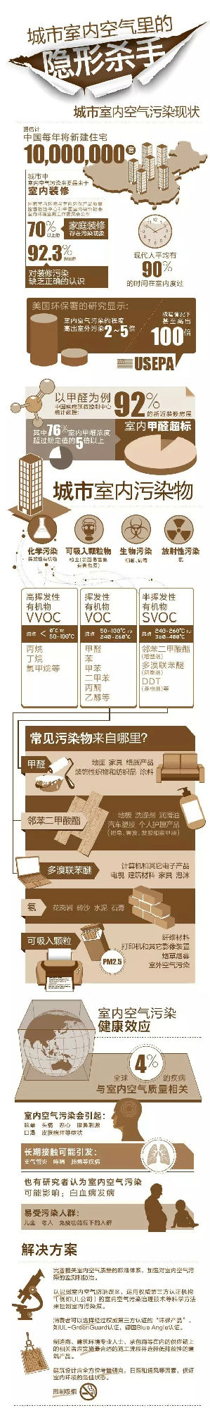 美國環保署的研究顯示,室內空氣污染可達室外污染的2倍-5倍,由此對健康造成的影響不容忽視。解決這個問題,最主要的是要多關注空氣質量相關常識,了解防治誤區,學會選擇環保合格的家居產品,從根本上杜絕空氣污染來源;其次,注意生活習慣,多通風、避免在室內抽煙等也可以幫助改善現有空氣質量。
