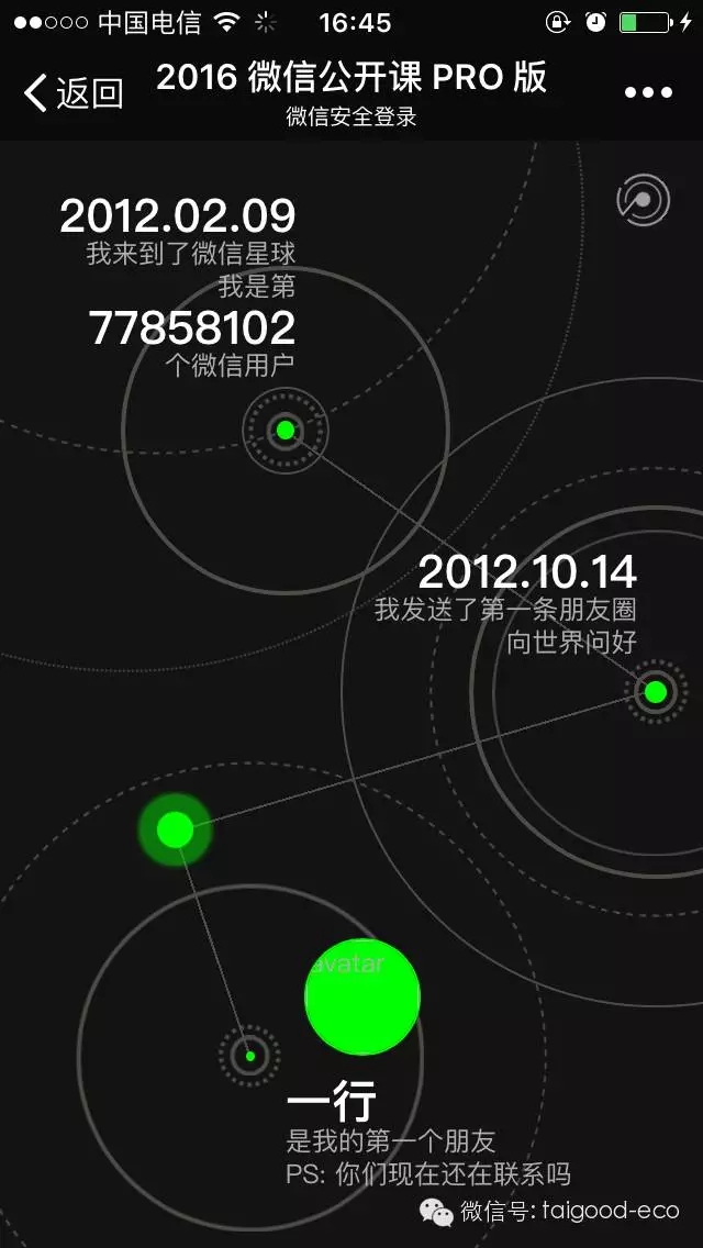 “2012年10月14日,我發送了第一條朋友圈向世界問好;一行是我的第一個朋友!边@兩天,朋友圈就像中毒一樣,一片黑壓壓綠熒熒,曬圖成災。