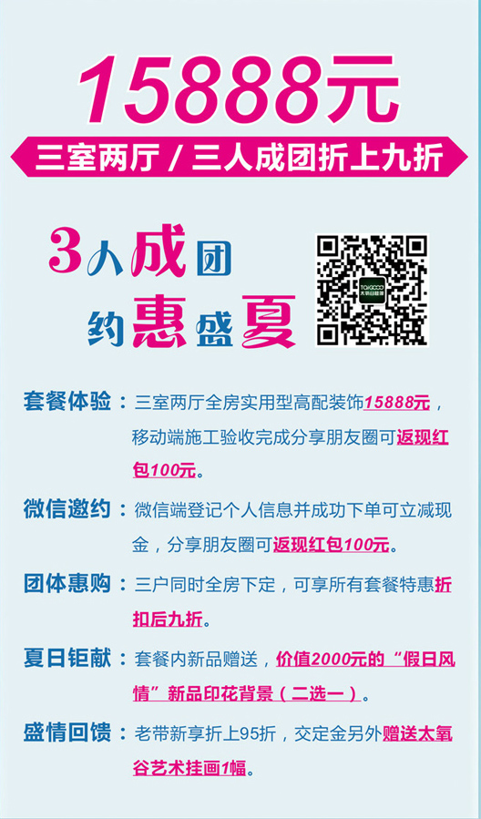 三人成團(tuán)折上九折 拉上業(yè)主鄰居,同事朋友,真正好的東西是需要分享的!團(tuán)購(gòu)不是十個(gè)人,不是八個(gè)人,也不是五個(gè)人,只需三戶,您就可以享受太氧谷硅藻泥前所未有的驚喜折扣,全房下定全部折扣優(yōu)惠下來(lái)各滿20000,享受團(tuán)購(gòu)價(jià)每人可節(jié)約2000元!這樣的優(yōu)惠,您還不心動(dòng)?