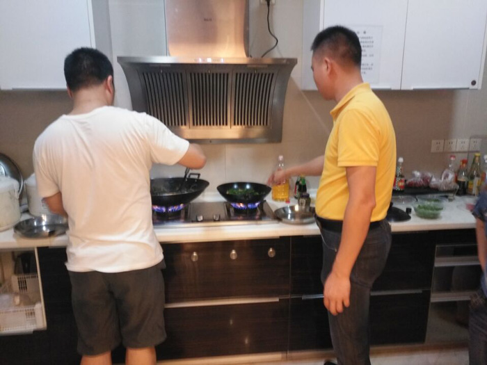 當然,也有一群人,開始操持忙碌大伙的晚餐,自己動手豐衣足食,有去市場買菜配料的,也有洗刷鍋碗瓢盆做準備工作的,當然一頓豐盛晚餐的出品需要團隊共同協作,才能奏起和諧的交響曲。由太氧谷品牌總監詹總負責總指揮,由空間設計部李經理負責掌勺,由人事部總務鄧總管負責采購協調,還有一眾青春活波的少女團負責后勤協助……從清鍋碗、洗菜、切菜、配菜到炒菜一條龍流水作業,大廚們拿手硬菜輪番出爐,色香味俱佳!領導親自掌廚,還有比我們更幸福的員工嗎?到最后開吃的時候,大伙兒連酒都顧不上喝,一個個吃貨本質盡顯,戰斗力爆表,幾乎把所有的菜都掃蕩而空,大有風卷殘云之勢!