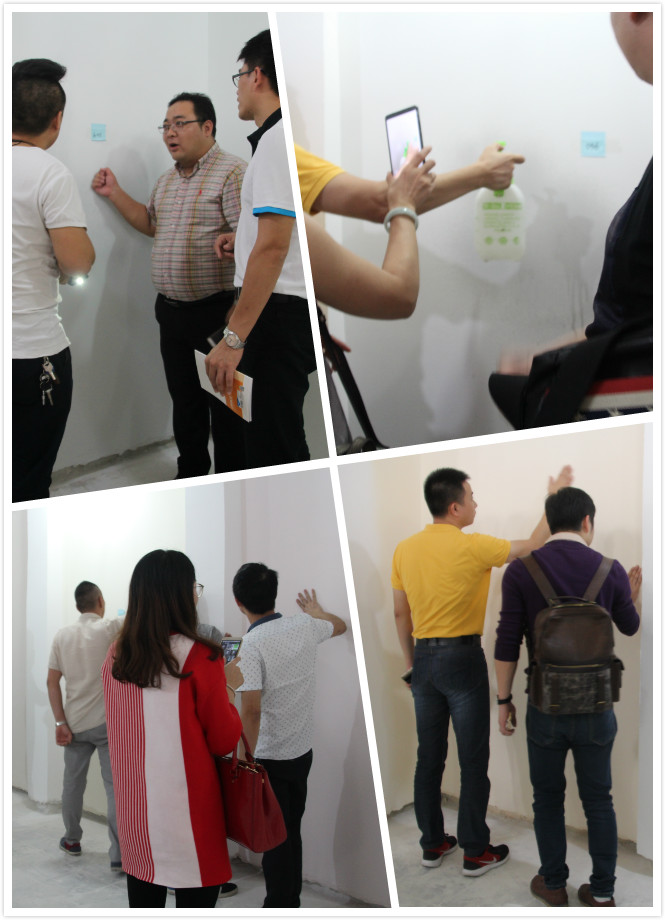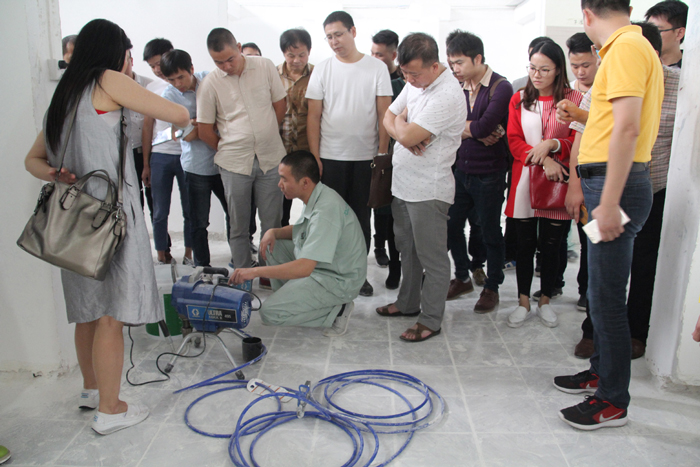 為了讓加盟商對新產品有更深刻的認識,在營銷總監劉小軍先生及品牌總監詹耀東先生兩位領導的帶領下,加盟商一眾人等率先來到太氧谷的施工打樣車間,現場觀摩和體驗了優谷新品,通過親眼看、噴水實驗、手掌觸摸等方式近距離感受了優谷的優質體驗感,同時,為了更好的理解美國無氣噴涂技術,太氧谷施工培訓老師詹國良還現場演示了新產品工藝的噴涂過程,施工的高效與便捷,令一眾人等嘆為觀止。